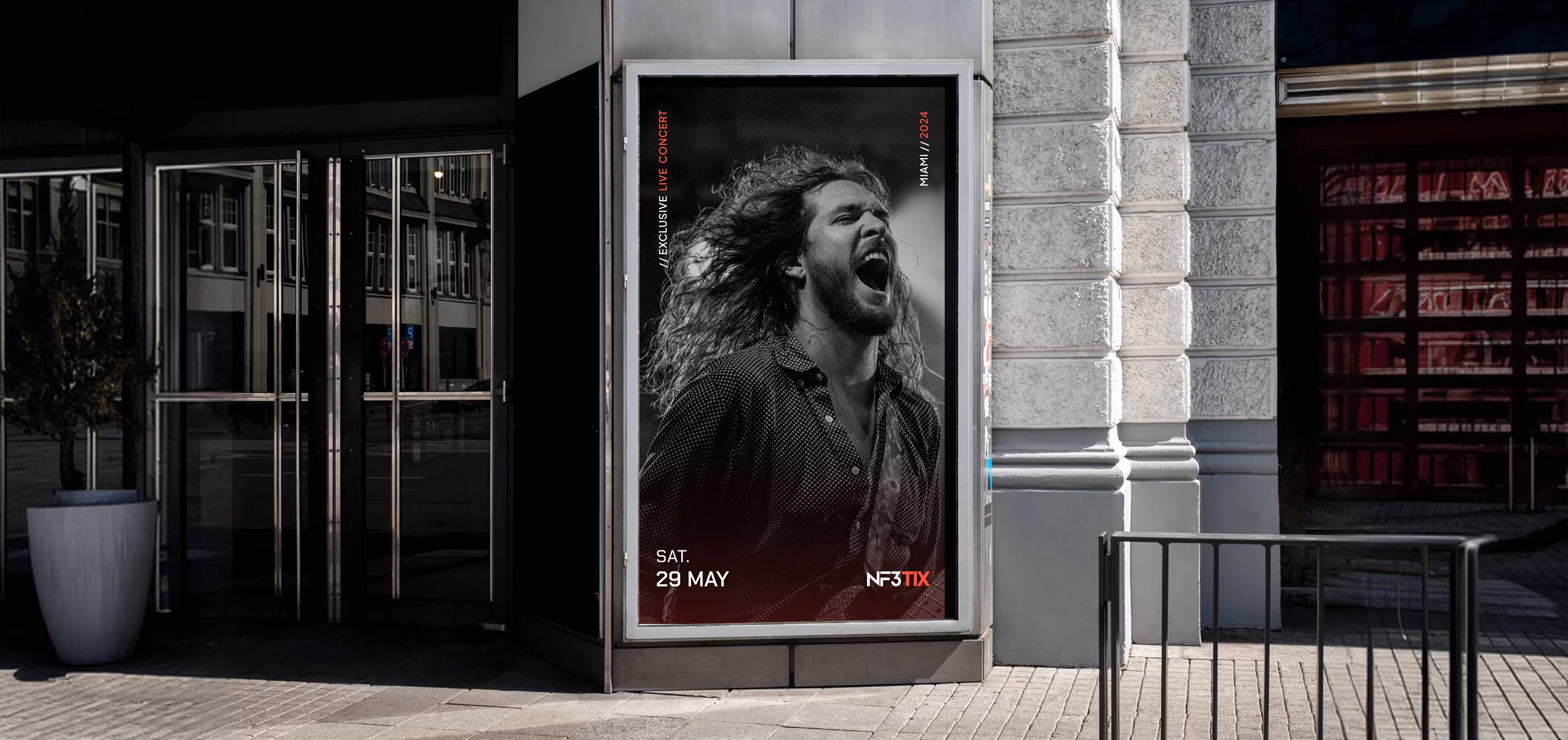 The NF3TIX visual identity is bold, high contrast, and unapologetically digital. Strong typography, dark surfaces, and sharp graphic elements create a sense of energy and anticipation similar to live event environments.