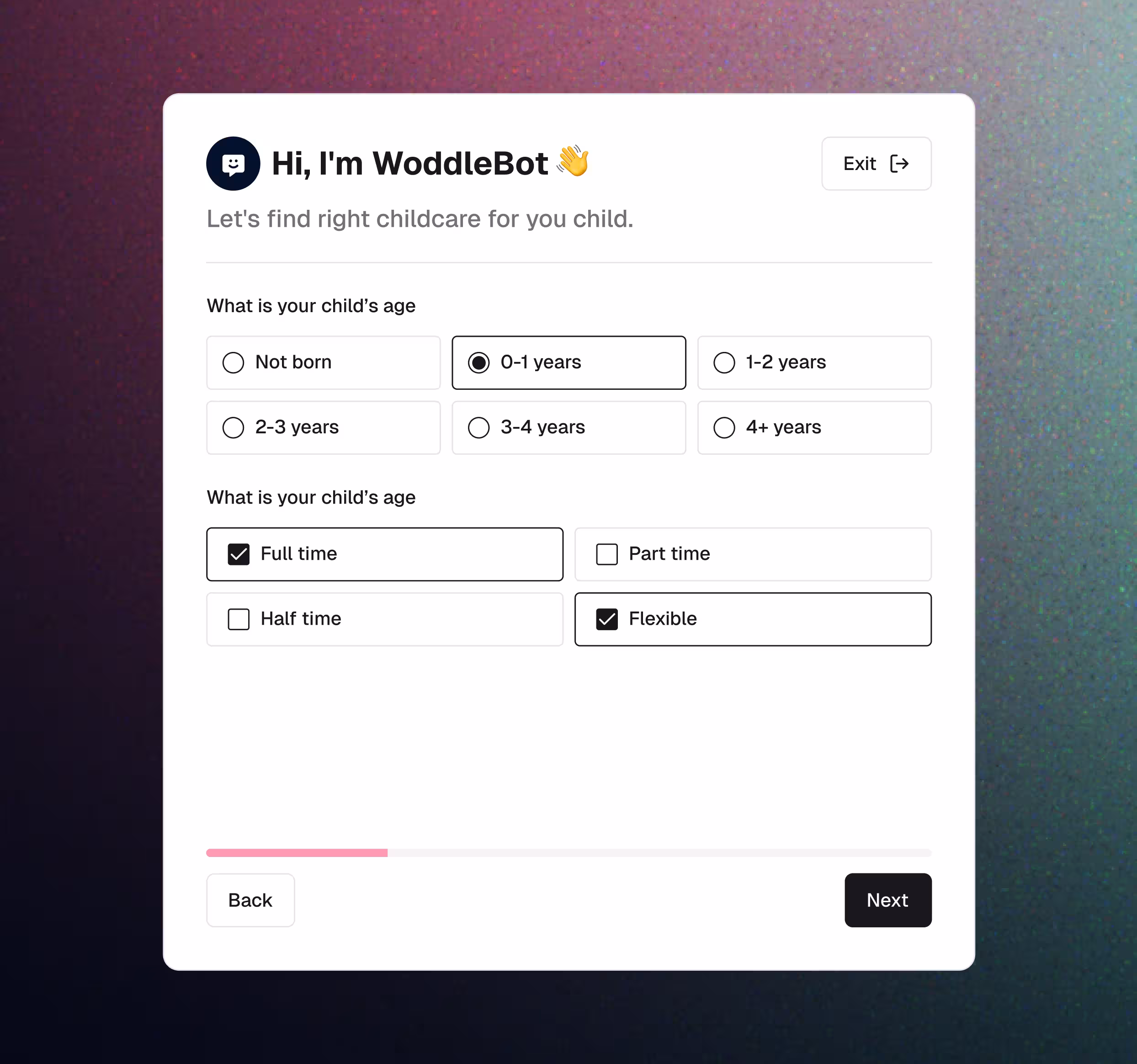 The Woddle Bot was designed as a conversational UI UX layer that simplifies nursery shortlisting through step based interactions. By replacing complex filters with guided questions, it captures parent preferences naturally, reduces cognitive effort, and delivers personalised recommendations that accelerate confident enquiries and bookings.
