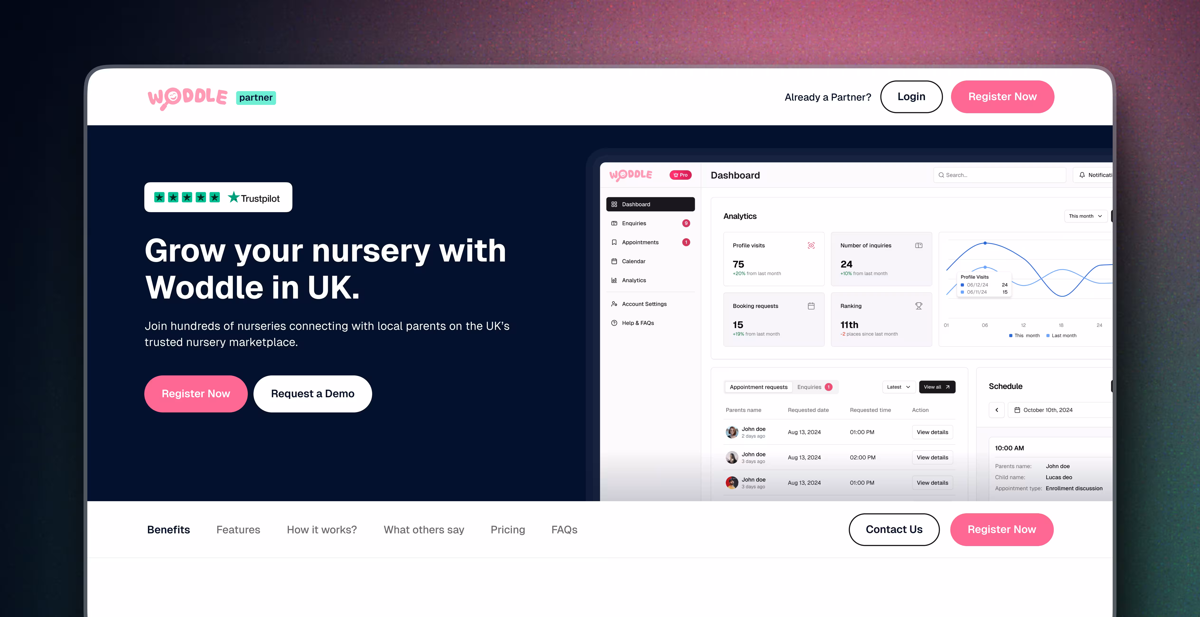 Woddle partnered with Tangle to simplify childcare discovery for parents while providing nurseries scalable tools for managing enquiries, bookings, and performance.